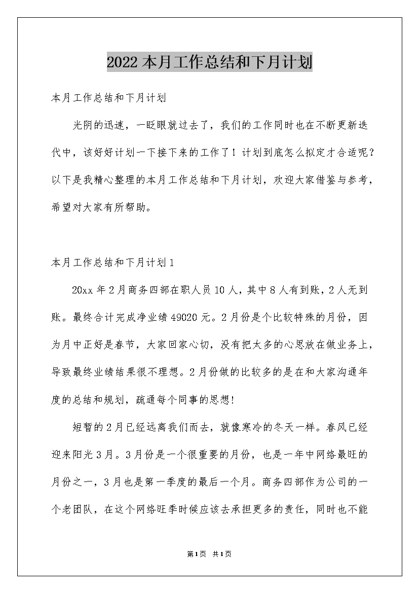 2022本月工作总结和下月计划