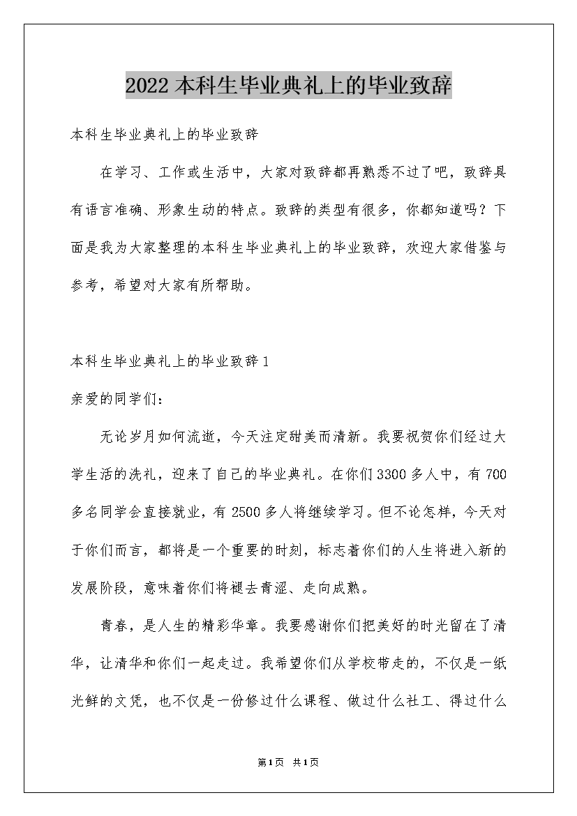2022本科生毕业典礼上的毕业致辞