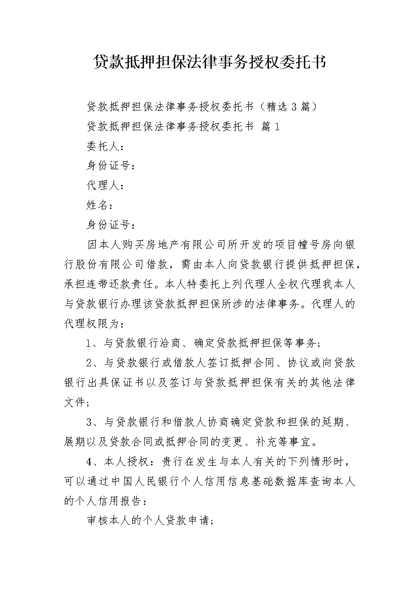 贷款抵押担保法律事务授权委托书