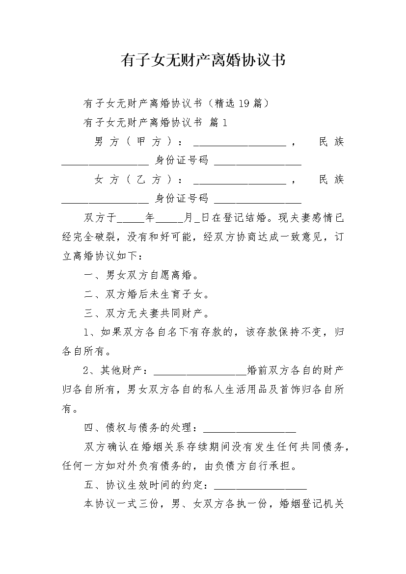 有子女无财产离婚协议书