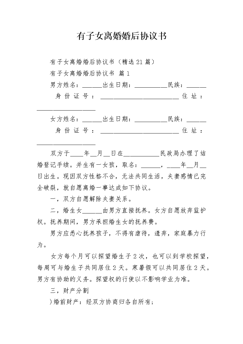 有子女离婚婚后协议书