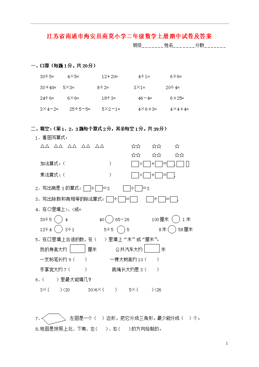 试题-江苏-2011_江苏省南通市海安县南莫小学二年级数学上学期期中试卷