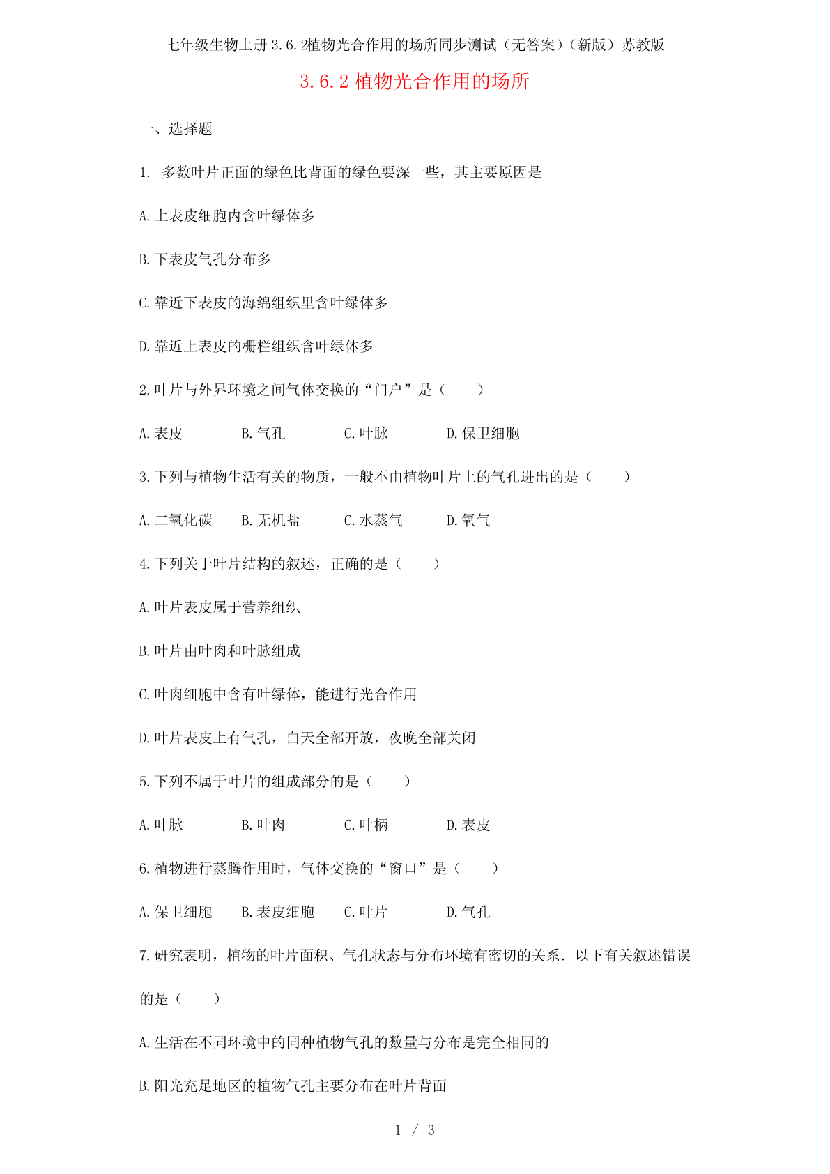 七年级生物上册3.6.2植物光合作用的场所同步测试(无答案)(新版)苏教版