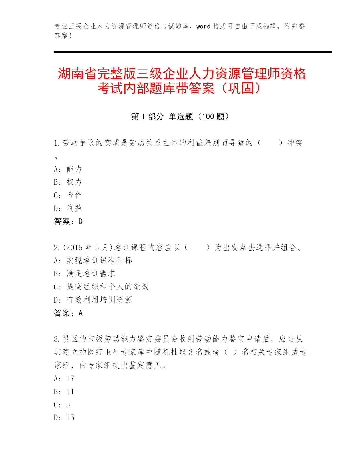 湖南省完整版三级企业人力资源管理师资格考试内部题库带答案(巩固)