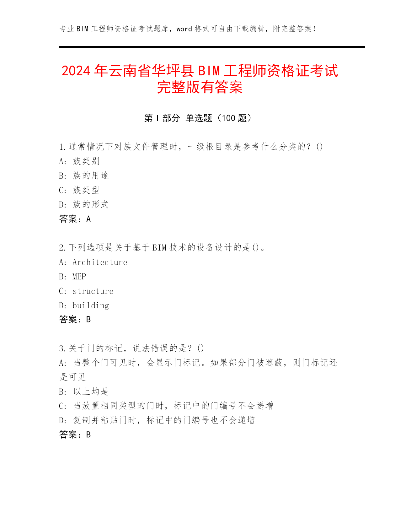 2024年云南省华坪县BIM工程师资格证考试完整版有答案