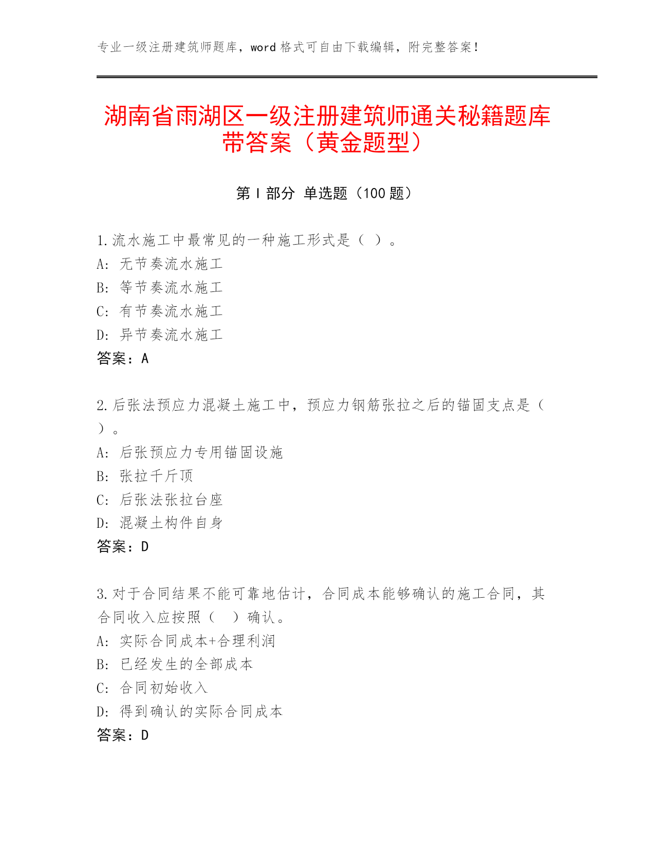 湖南省雨湖区一级注册建筑师通关秘籍题库带答案(黄金题型)