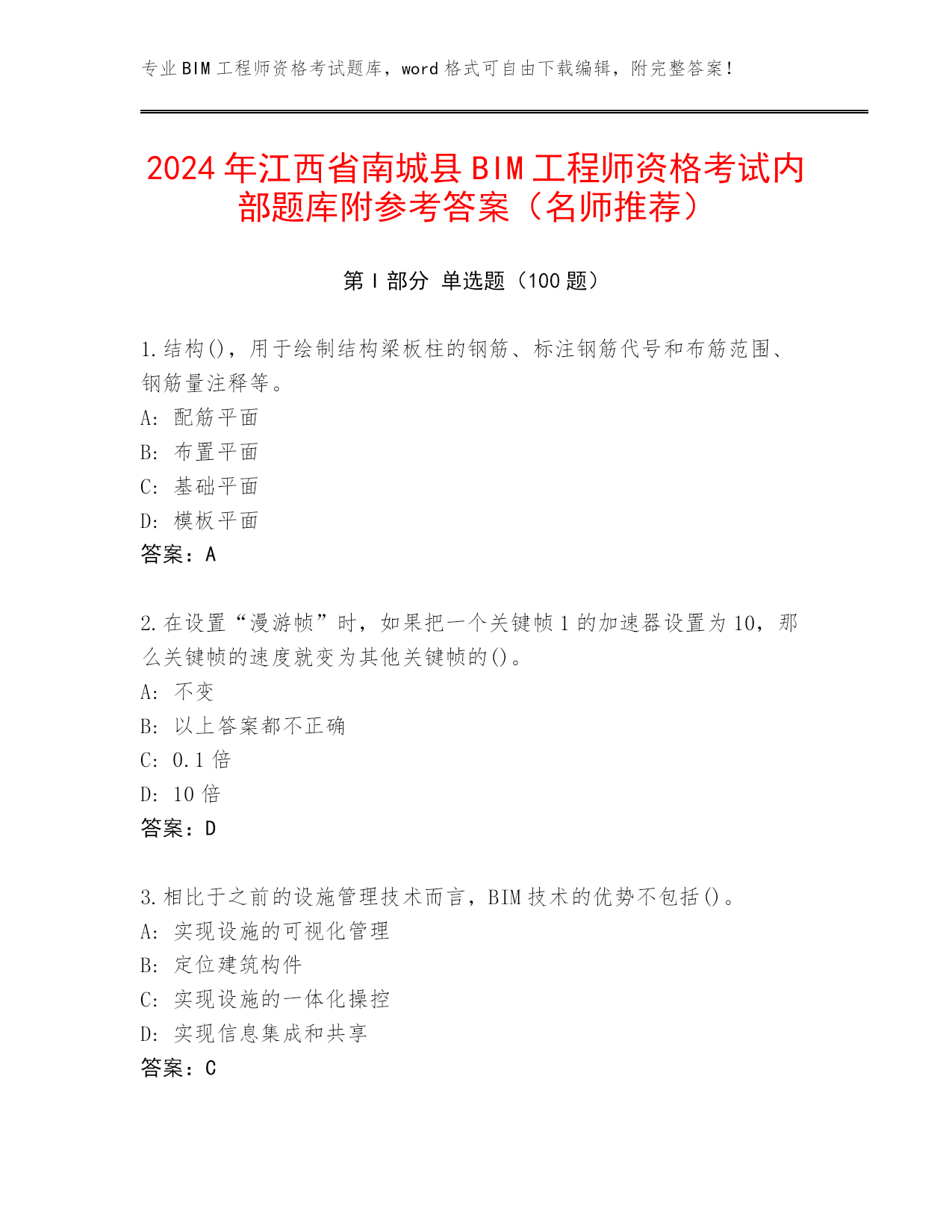 2024年江西省南城县BIM工程师资格考试内部题库附参考答案(名师推荐)