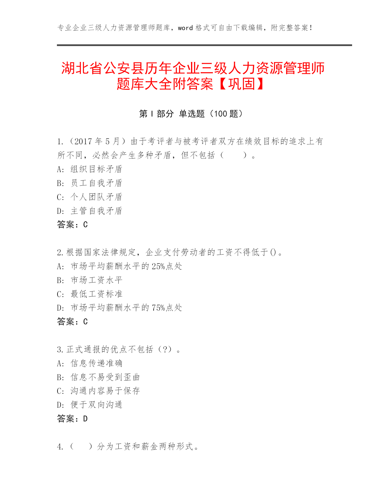 湖北省公安县历年企业三级人力资源管理师题库大全附答案【巩固】