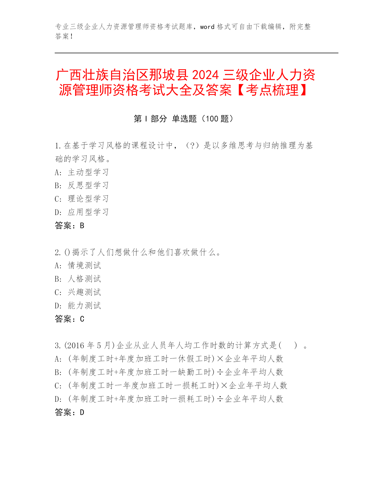 广西壮族自治区那坡县2024三级企业人力资源管理师资格考试大全及答案【考点梳理】