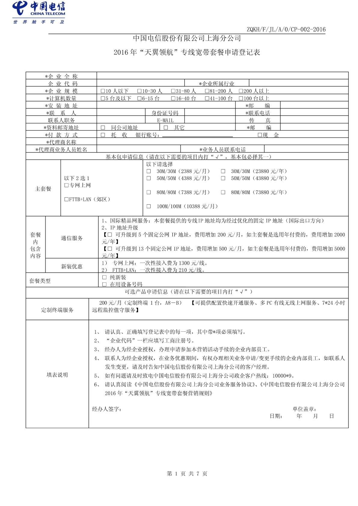 2016天翼领航专线宽带套餐申请登记表(代理渠道版)概要1讲解