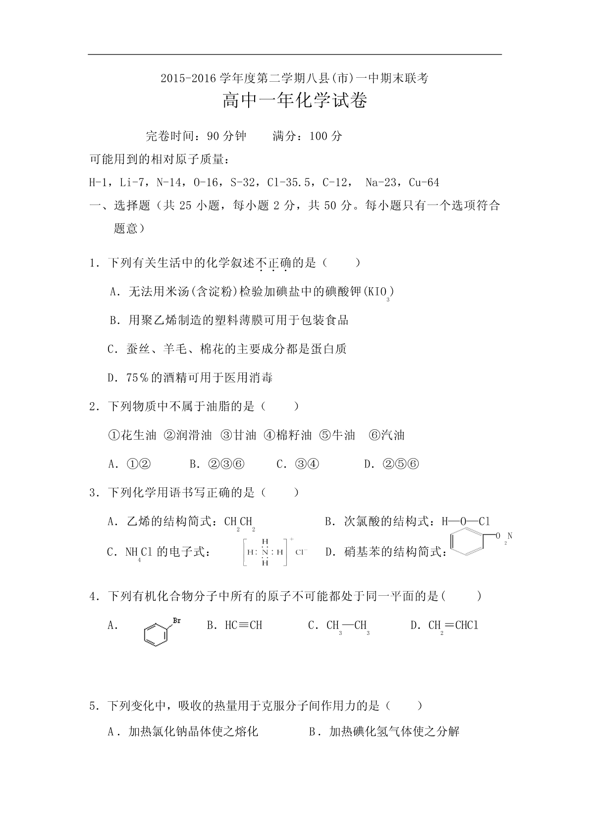 2015-2016学年福建省八县一中高一下学期期末考试化学试题讲解