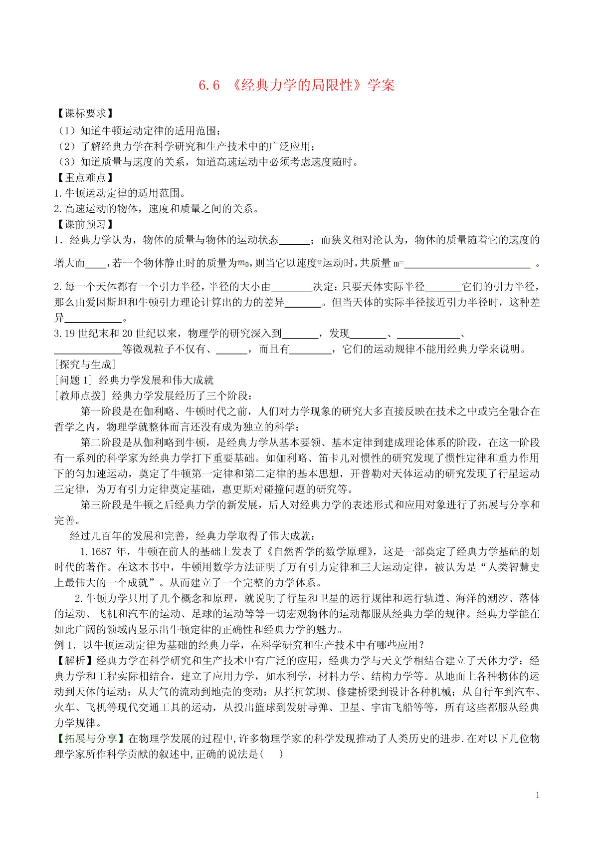 2015年高中物理 第六章《经典力学的局限性》学案 新人教版必修2讲解