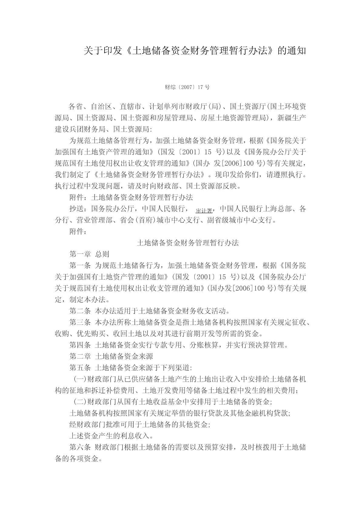 《土地储备资金财务管理暂行办法》的通知(财综〔2007〕17号)