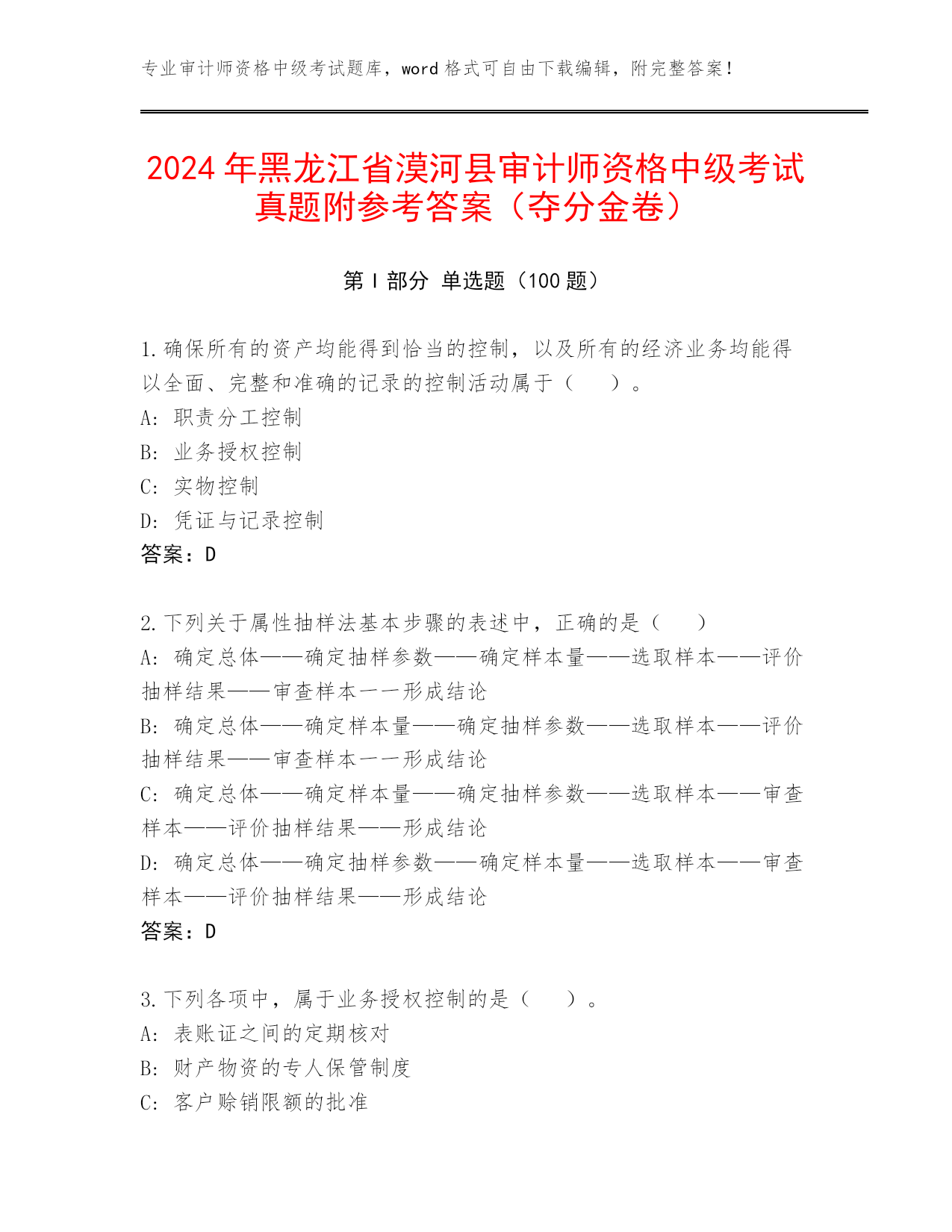 2024年黑龙江省漠河县审计师资格中级考试真题附参考答案(夺分金卷)