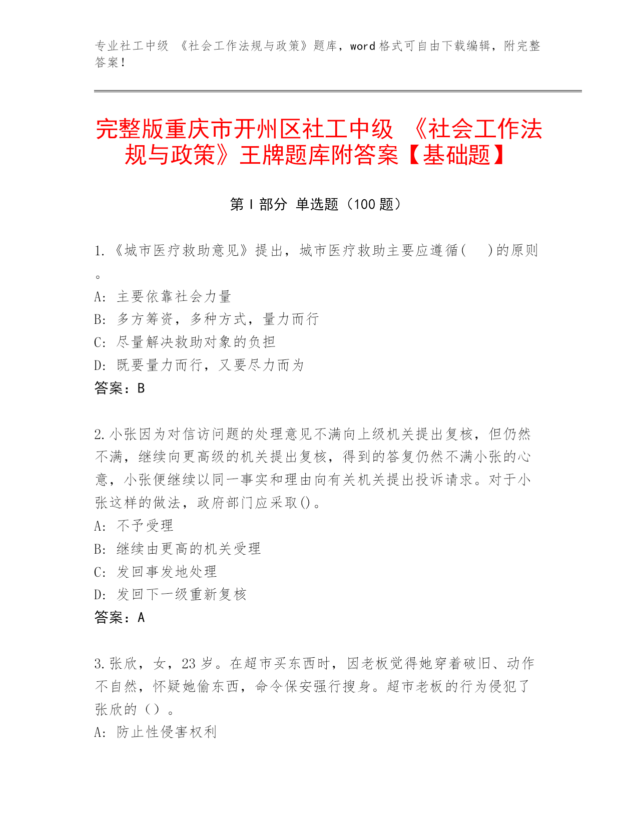 完整版重庆市开州区社工中级 《社会工作法规与政策》王牌题库附答案【基础题】