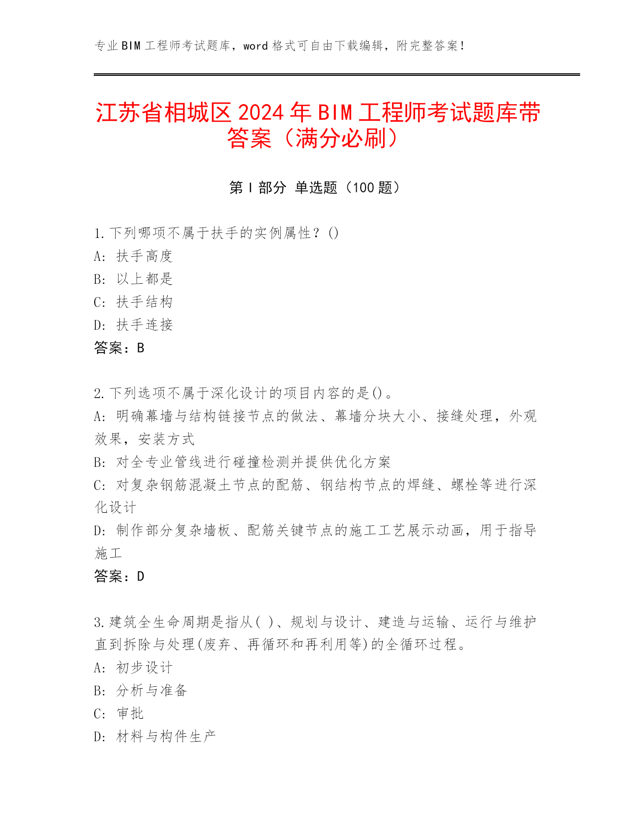 江苏省相城区2024年BIM工程师考试题库带答案(满分必刷)