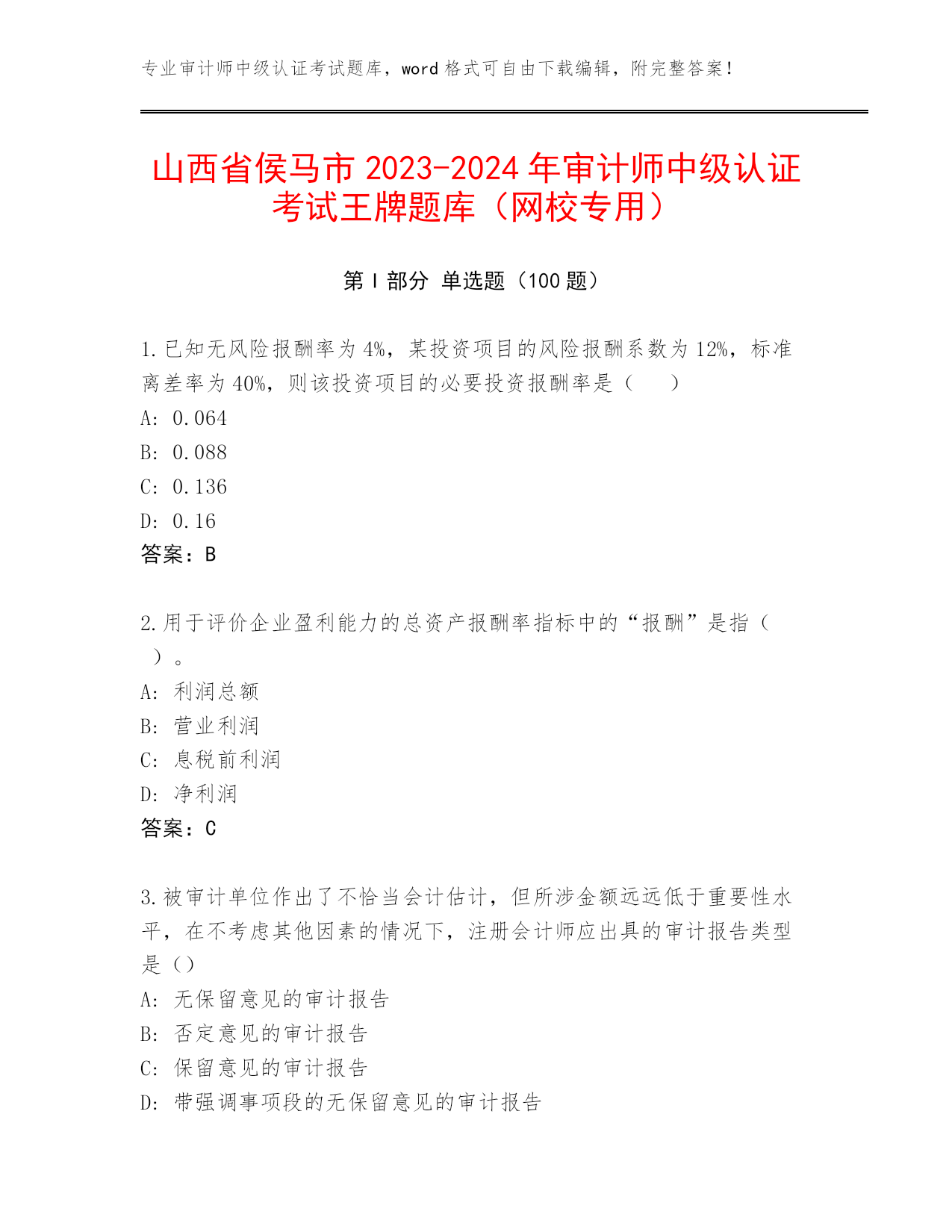 山西省侯马市2023-2024年审计师中级认证考试王牌题库(网校专用)