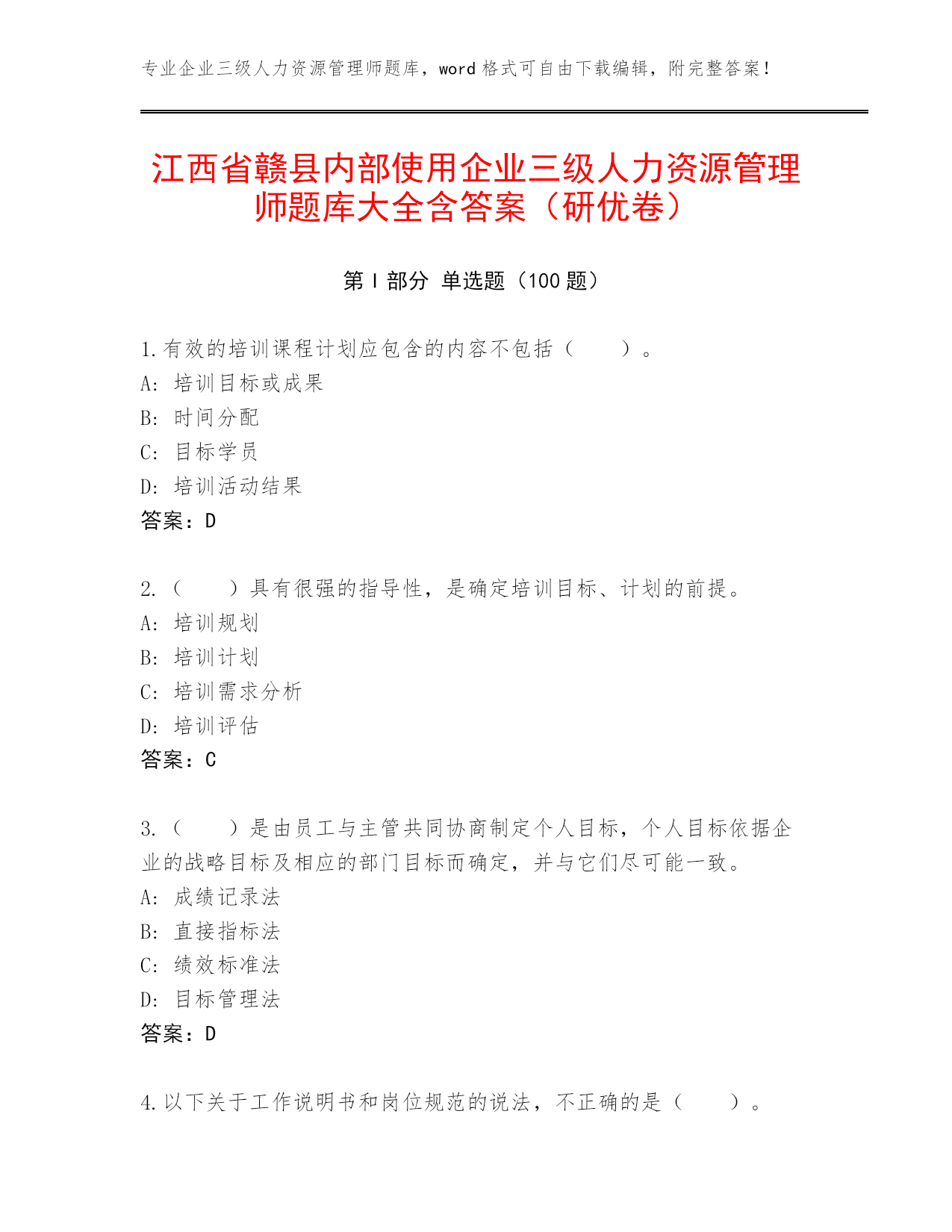 江西省赣县内部使用企业三级人力资源管理师题库大全含答案(研优卷)