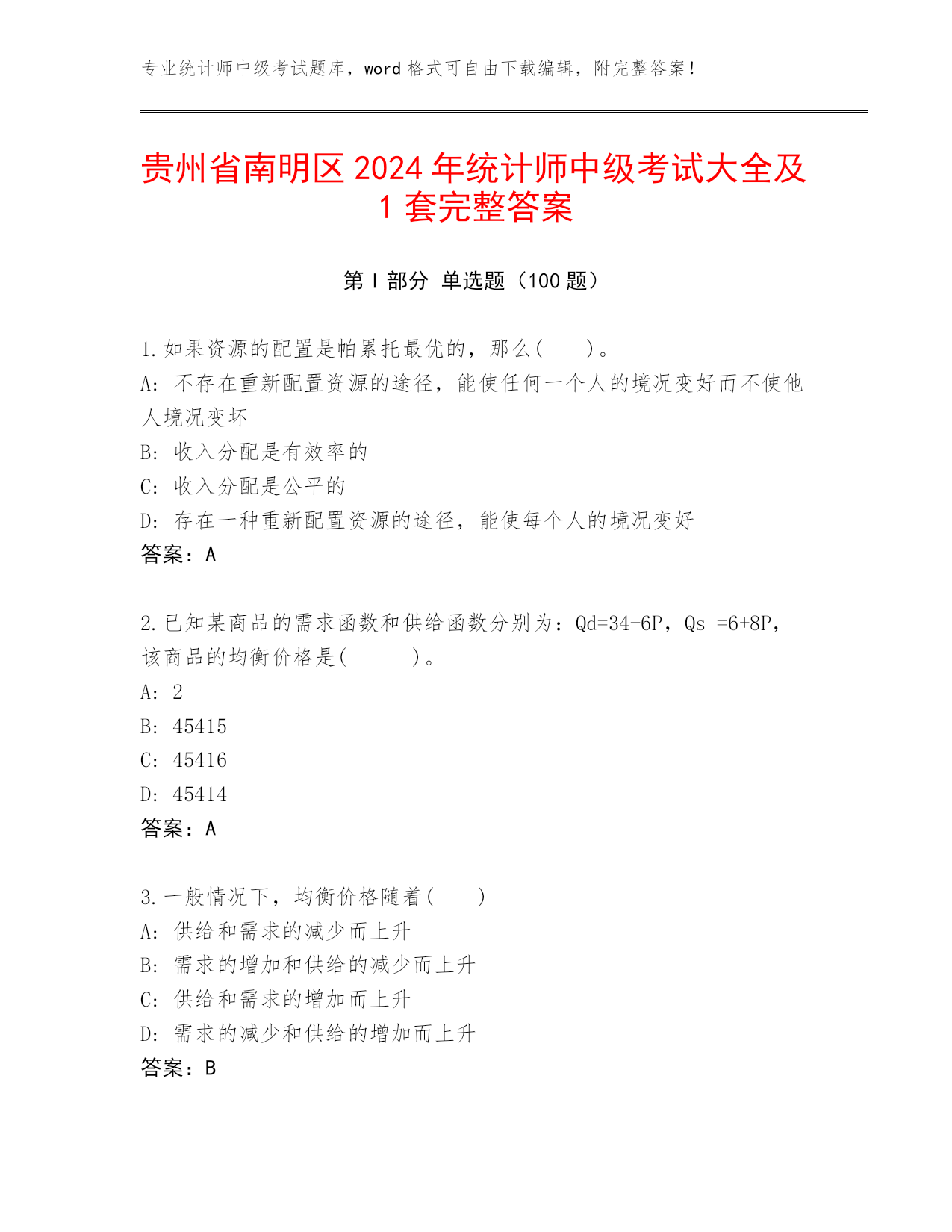 贵州省南明区2024年统计师中级考试大全及1套完整答案