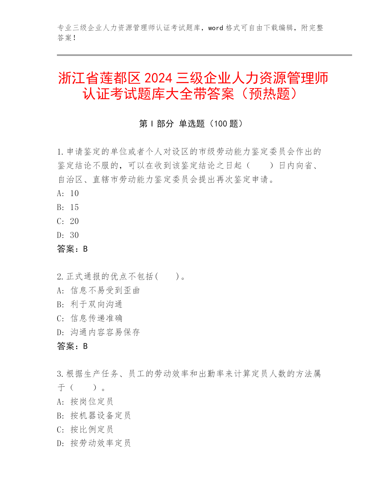 浙江省莲都区2024三级企业人力资源管理师认证考试题库大全带答案(预热题)