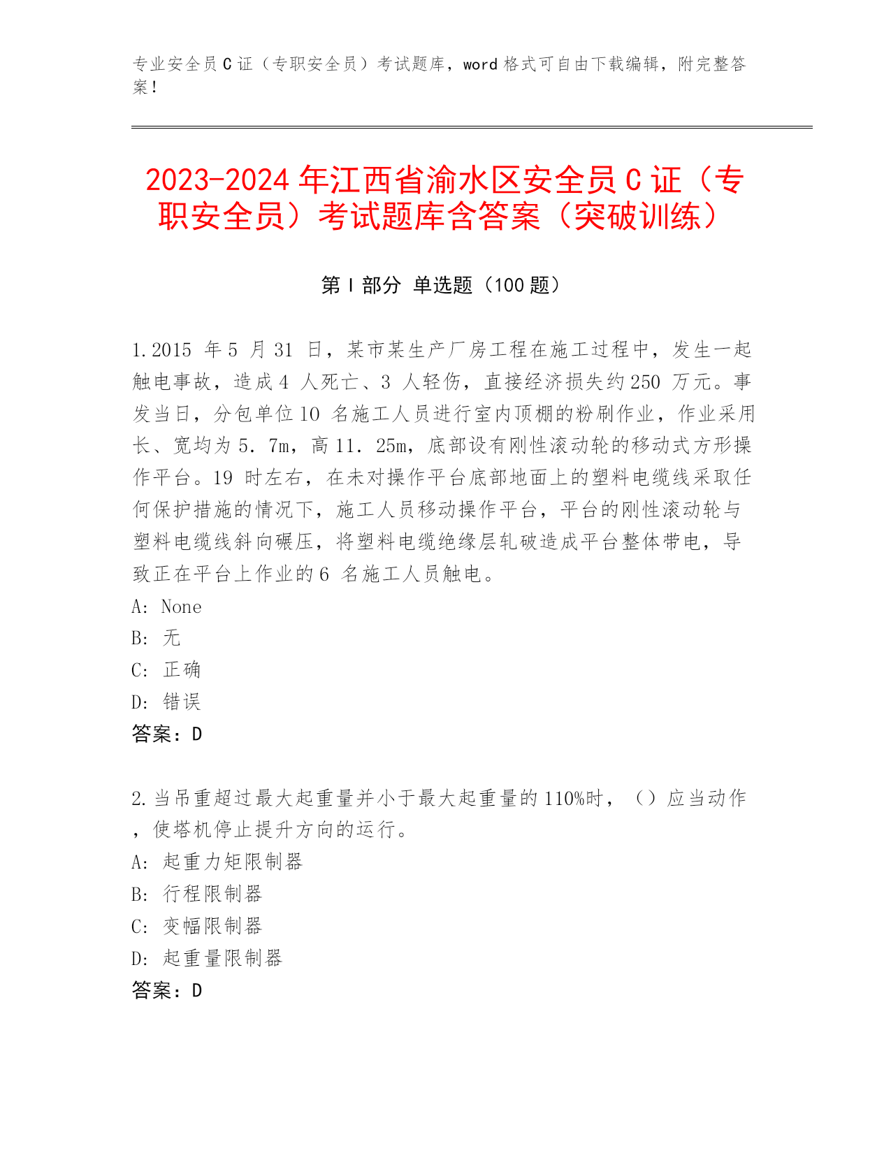 2023-2024年江西省渝水区安全员C证(专职安全员)考试题库含答案(突破训练)