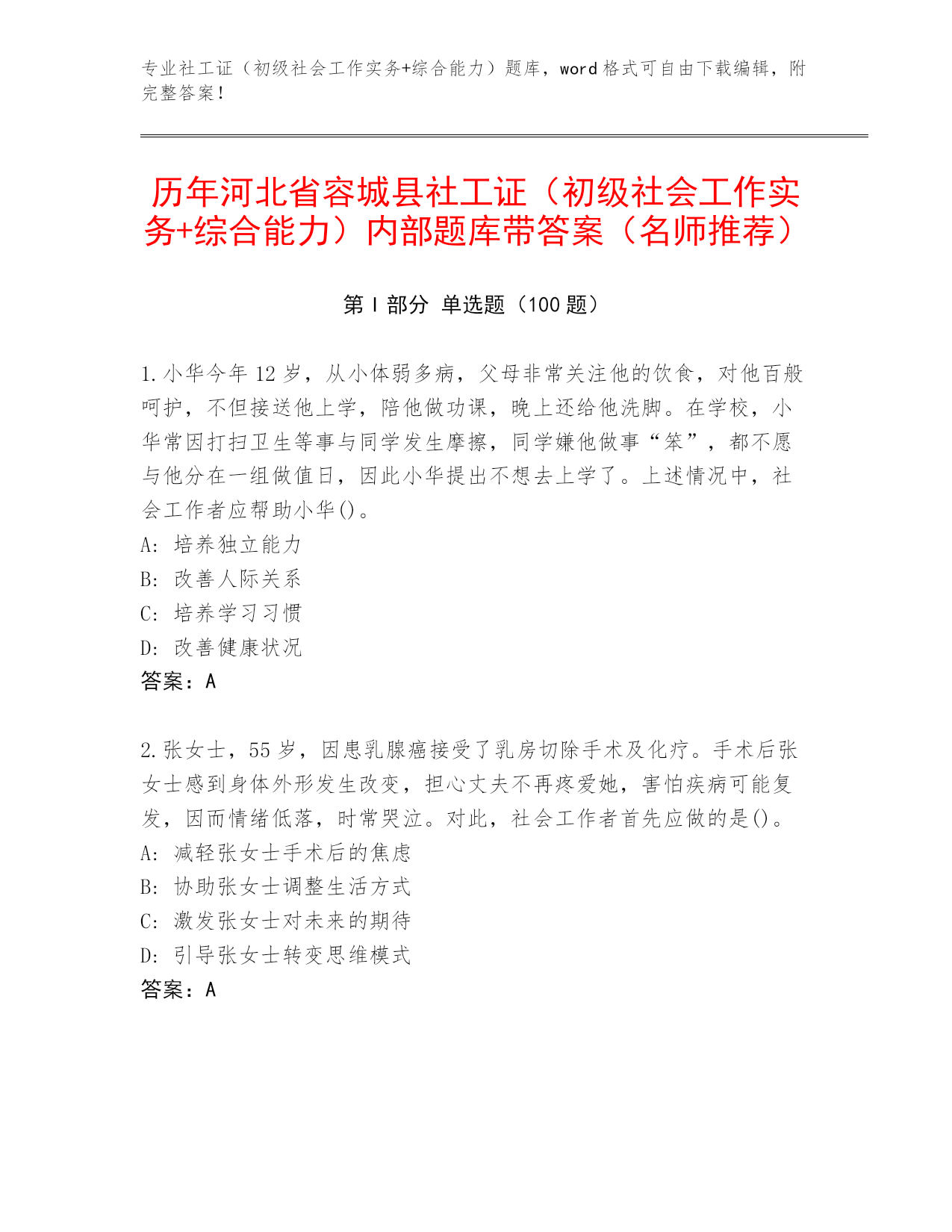 历年河北省容城县社工证(初级社会工作实务+综合能力)内部题库带答案(名师推荐)