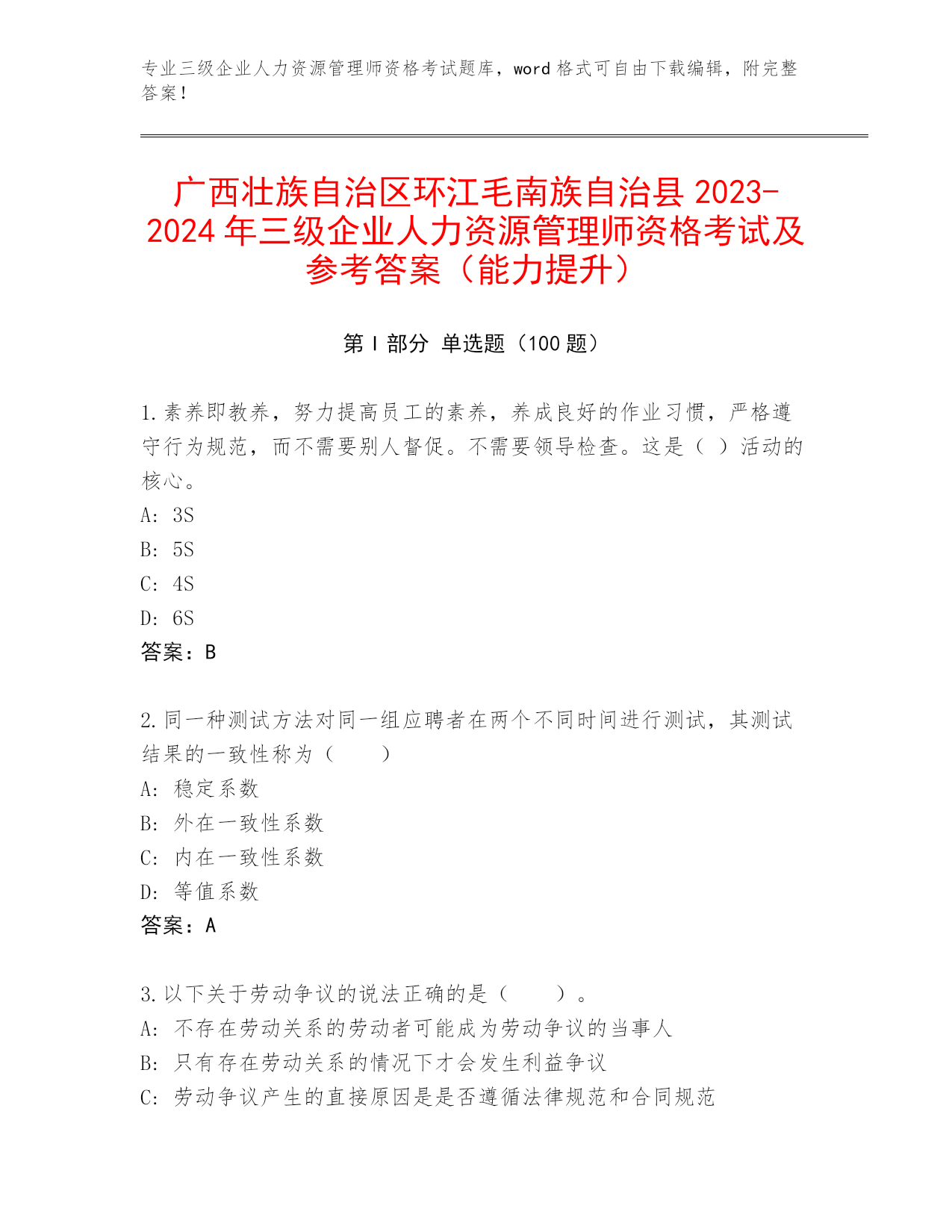 广西壮族自治区环江毛南族自治县2023-2024年三级企业人力资源管理师资格考试及参考答案(能力提升)