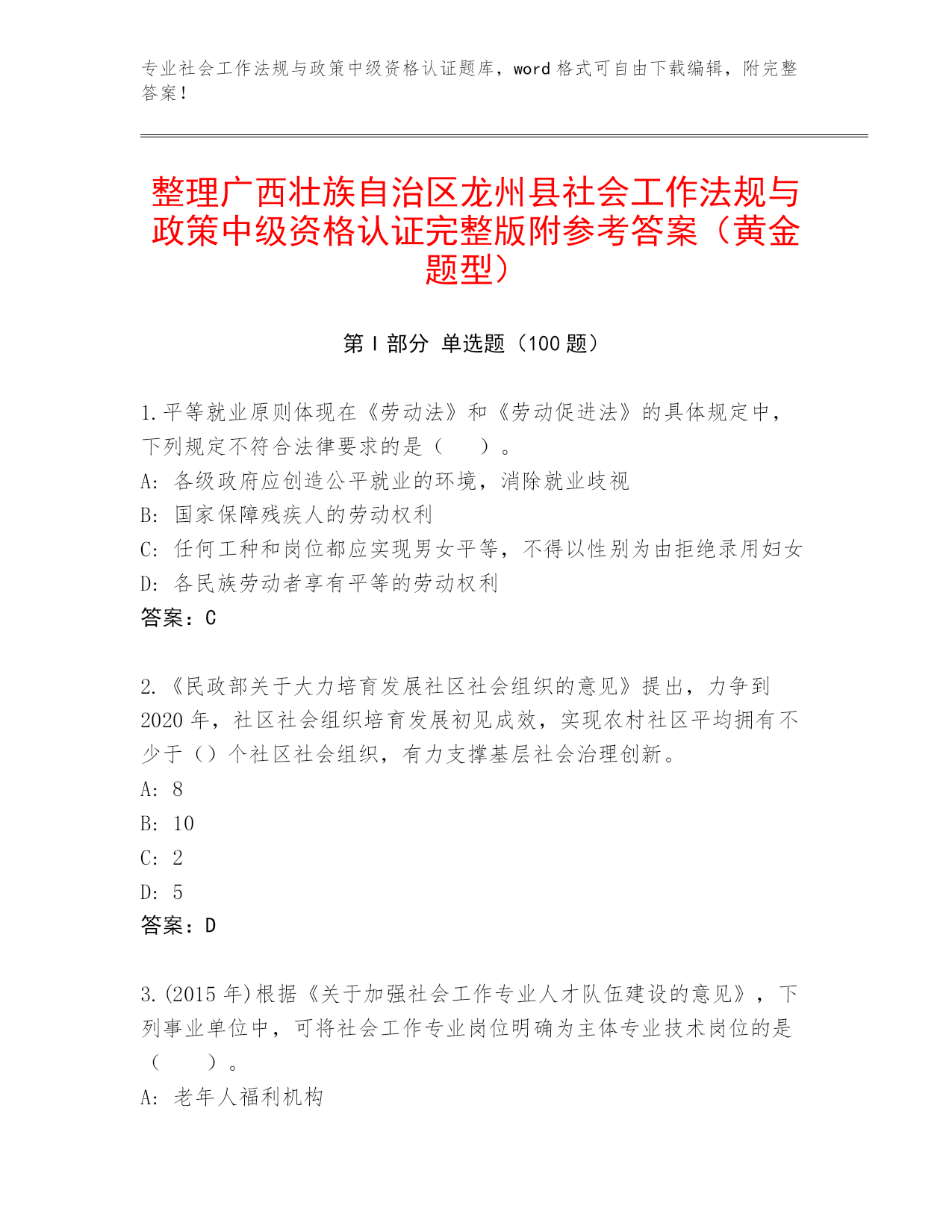 整理广西壮族自治区龙州县社会工作法规与政策中级资格认证完整版附参考答案(黄金题型)
