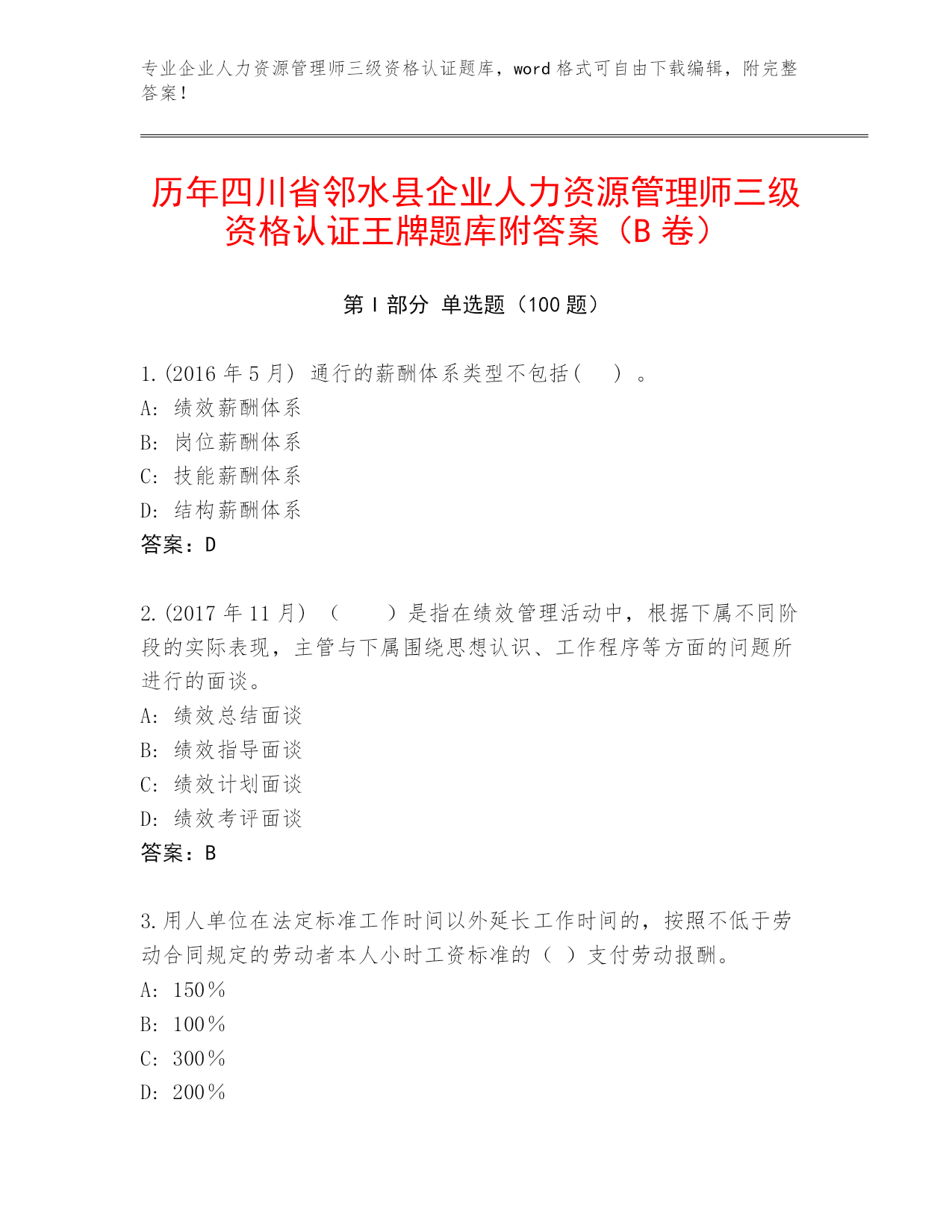历年四川省邻水县企业人力资源管理师三级资格认证王牌题库附答案(B卷)