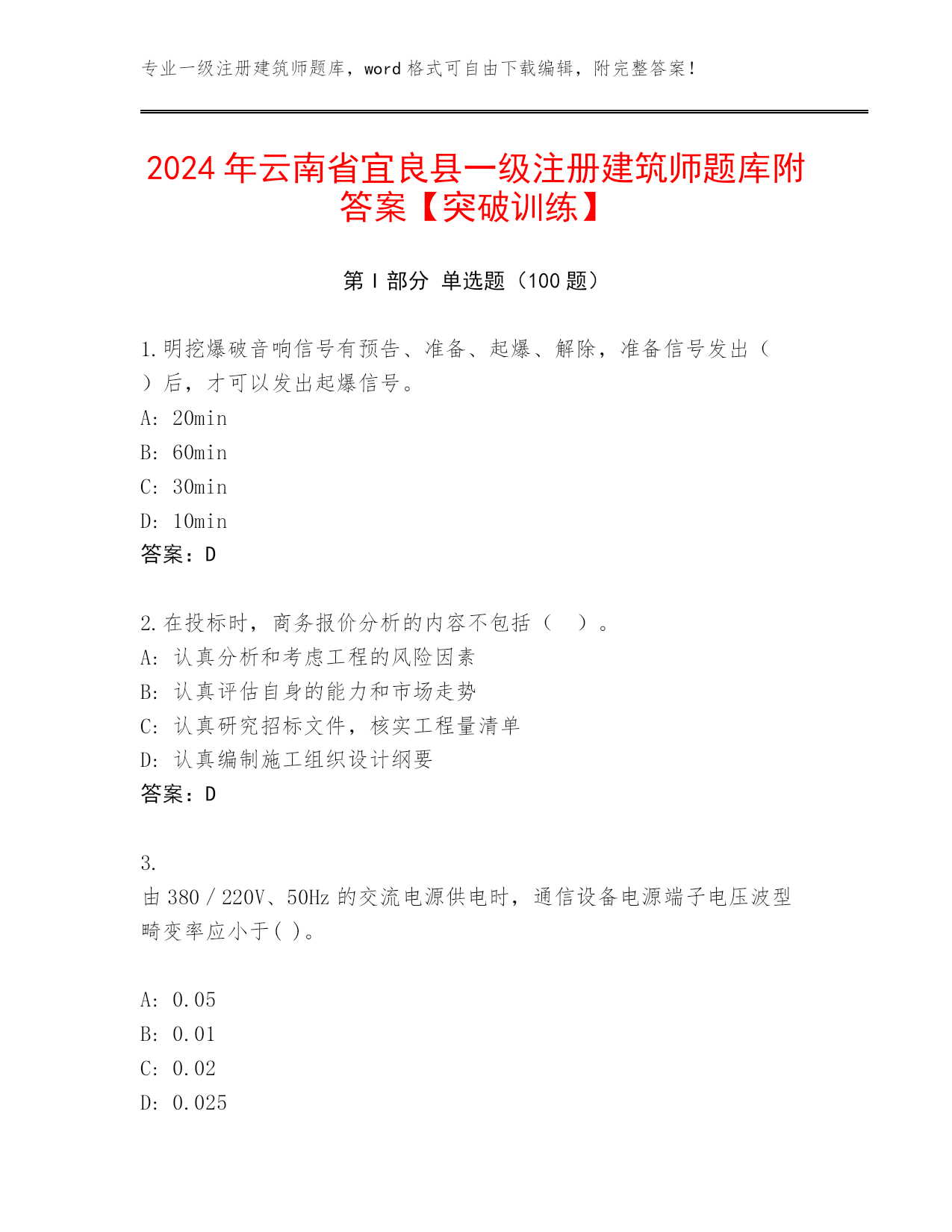 2024年云南省宜良县一级注册建筑师题库附答案【突破训练】