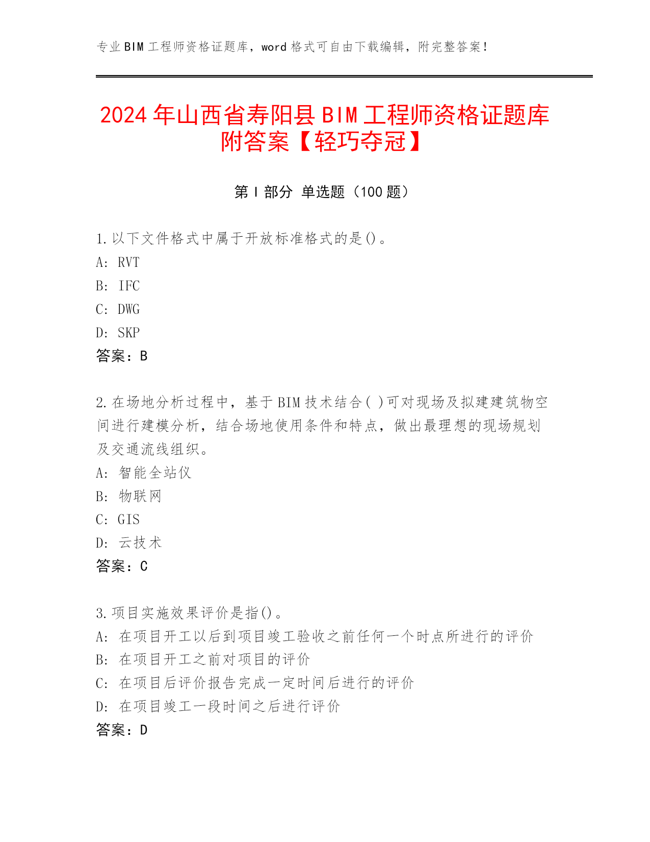 2024年山西省寿阳县BIM工程师资格证题库附答案【轻巧夺冠】