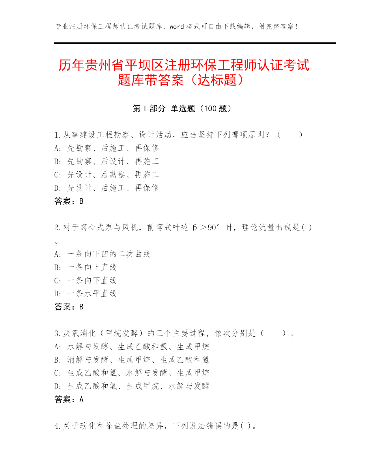 历年贵州省平坝区注册环保工程师认证考试题库带答案(达标题)