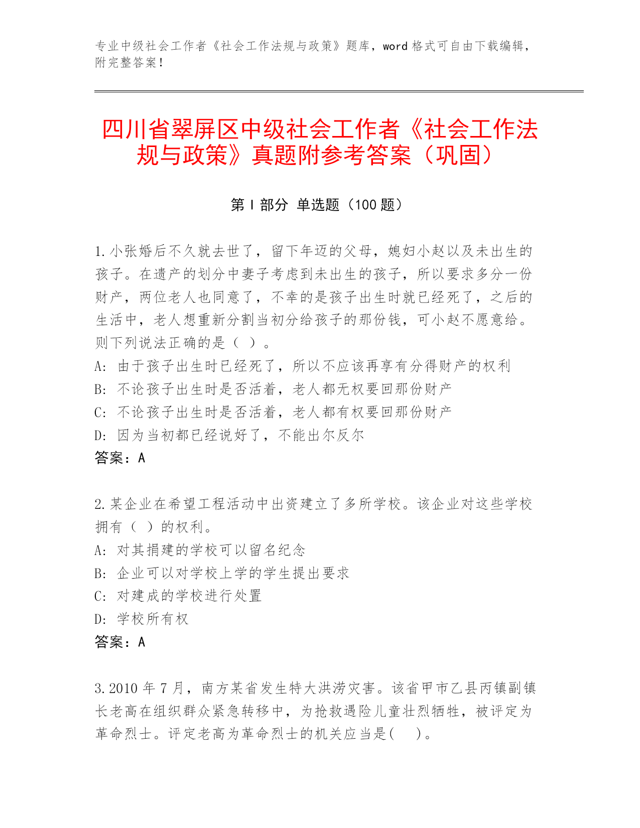 四川省翠屏区中级社会工作者《社会工作法规与政策》真题附参考答案(巩固)