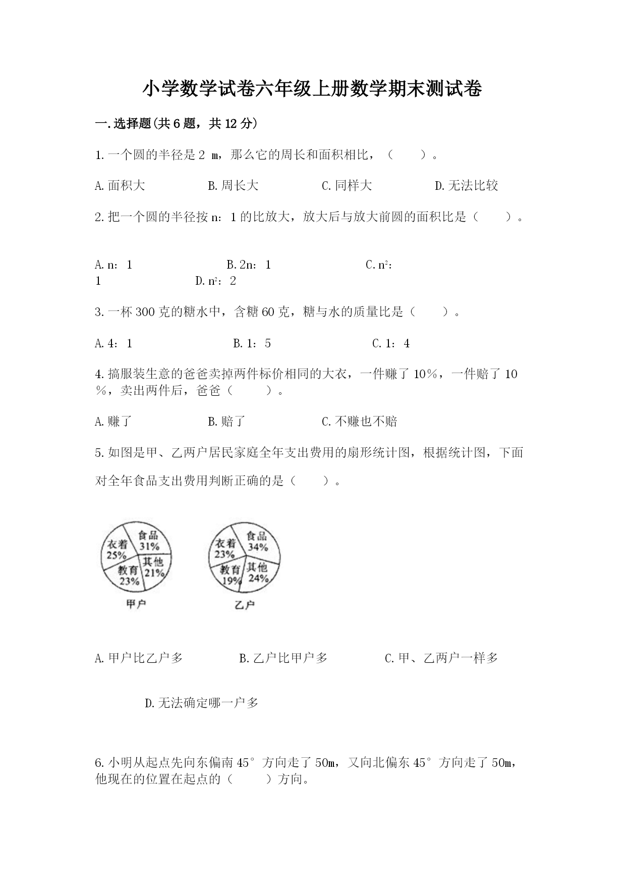 小学数学试卷六年级上册数学期末测试卷及答案(名校卷)