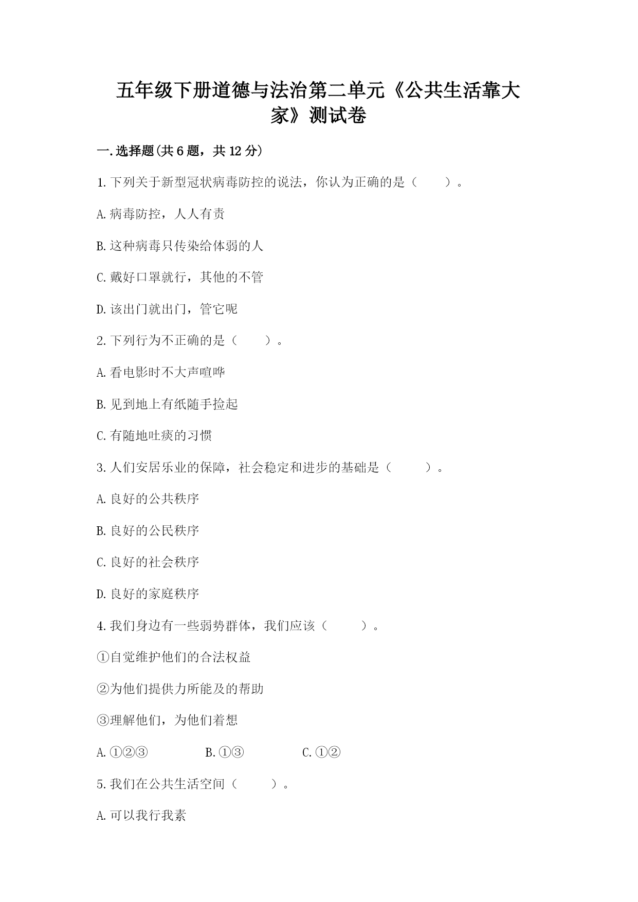 五年级下册道德与法治第二单元《公共生活靠大家》测试卷附参考答案(综合题)