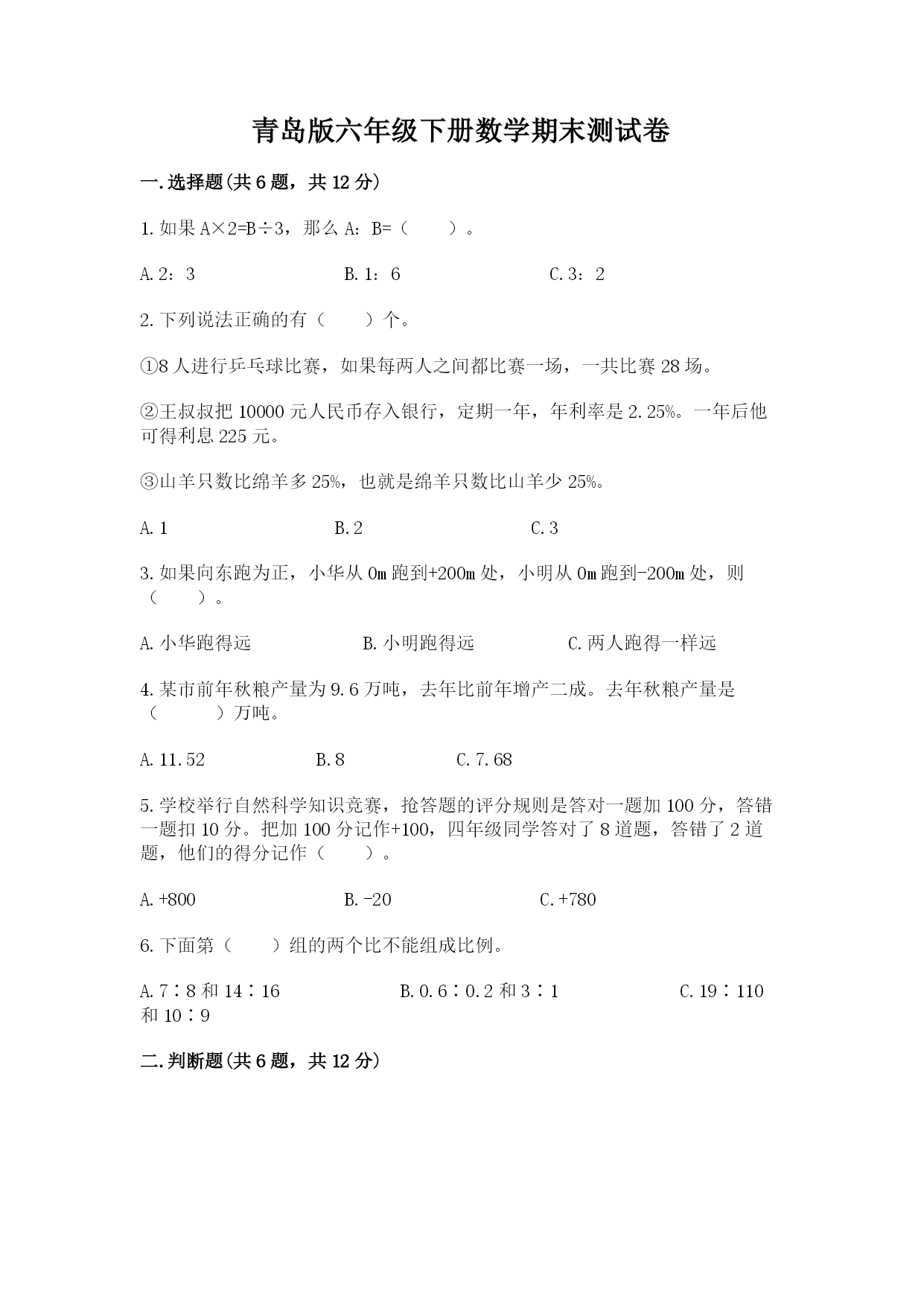 青岛版小学数学六年级下册期末检测试题【含答案】