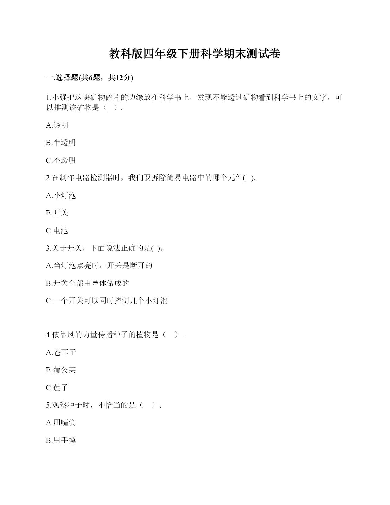 教科版四年级下册科学期末测试卷及完整答案(历年真题)