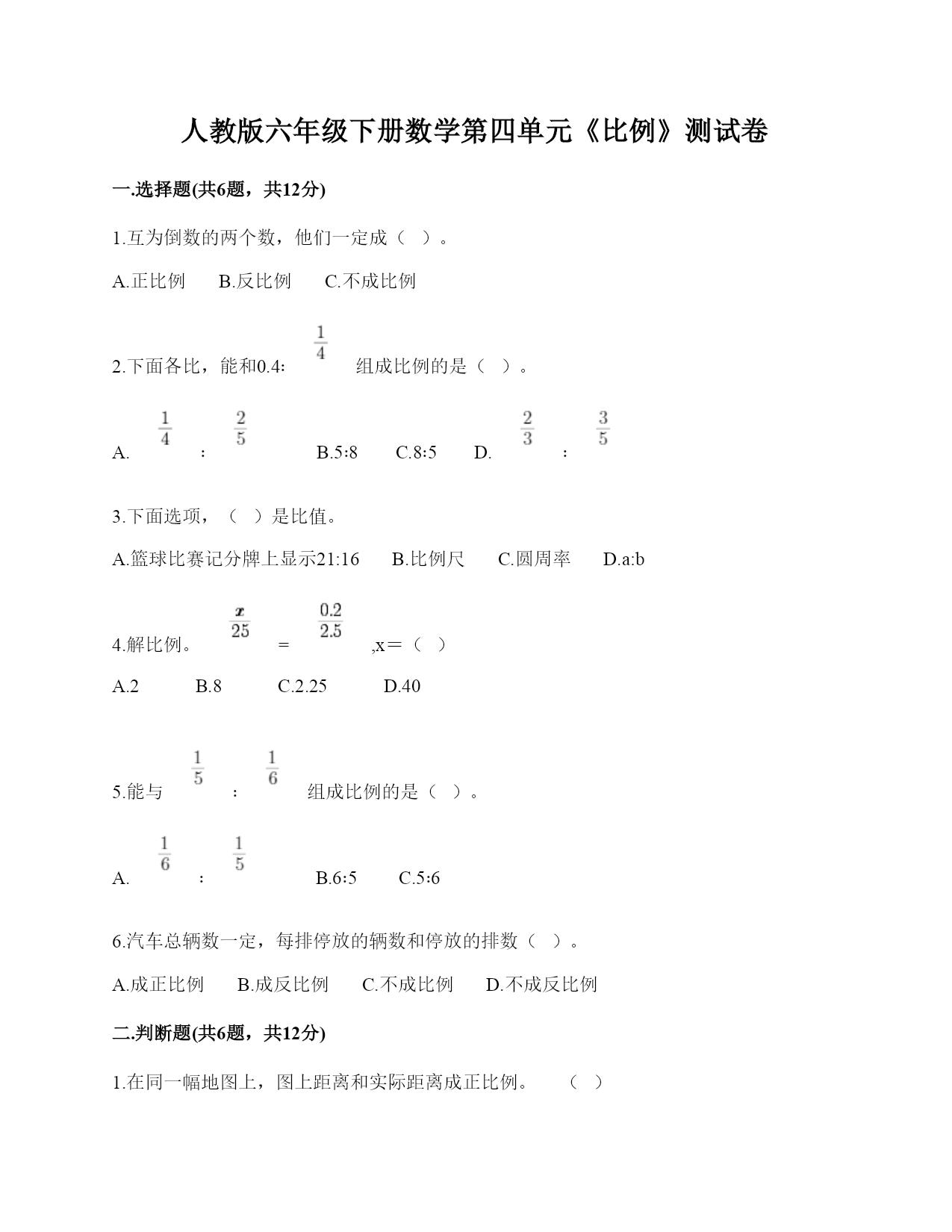 人教版六年级下册数学第四单元《比例》测试卷及参考答案【考试直接用】