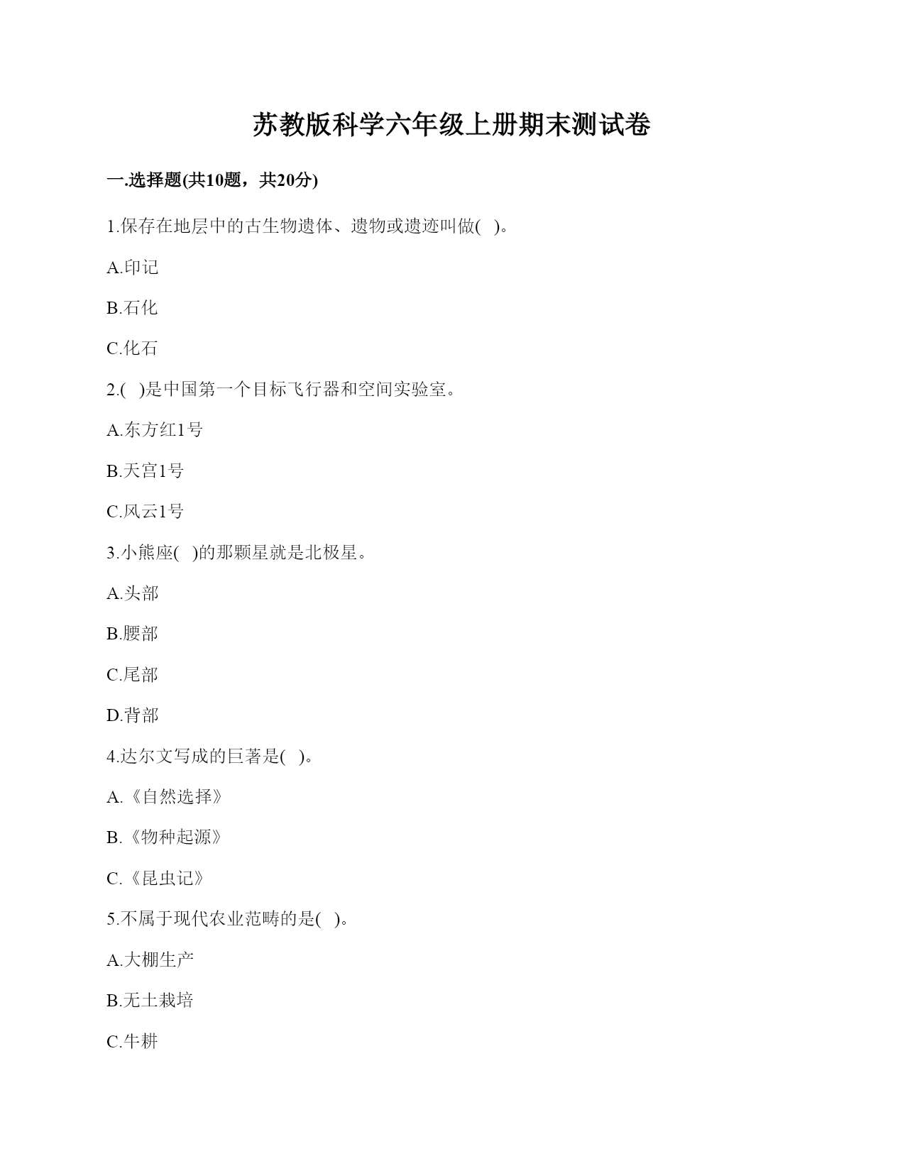 苏教版科学六年级上册期末测试卷附参考答案【研优卷】