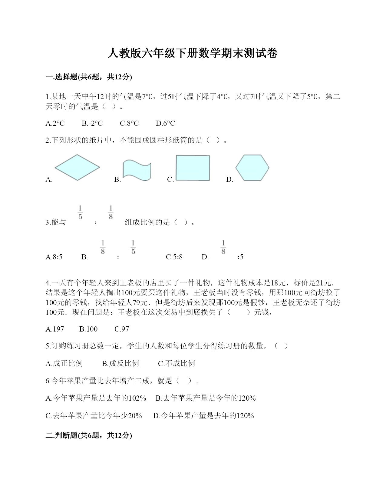 2024年人教版六年级下册数学期末测试卷附参考答案(培优b卷)