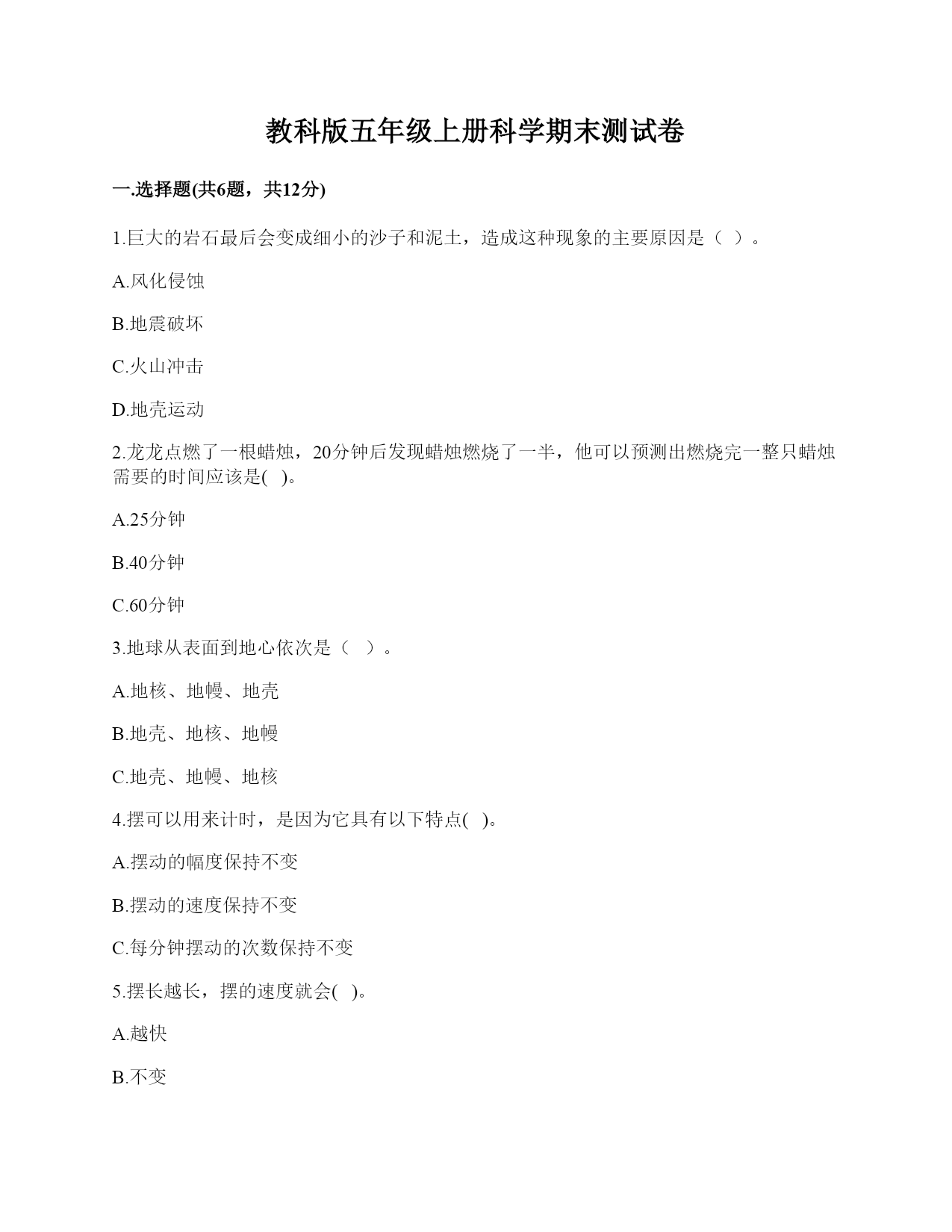 教科版五年级上册科学期末测试卷带答案(综合题)