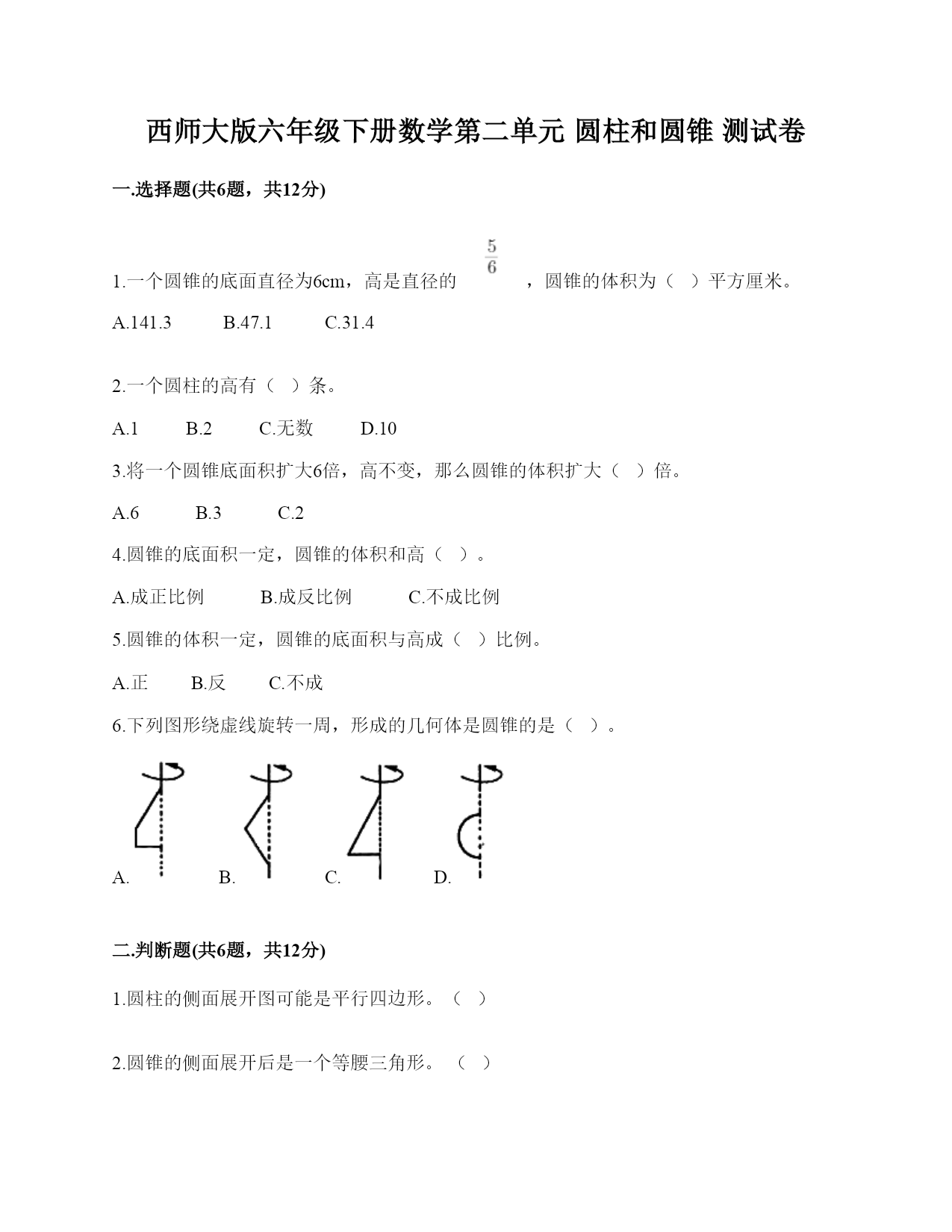 西师大版六年级下册数学第二单元 圆柱和圆锥 测试卷含答案(a卷)