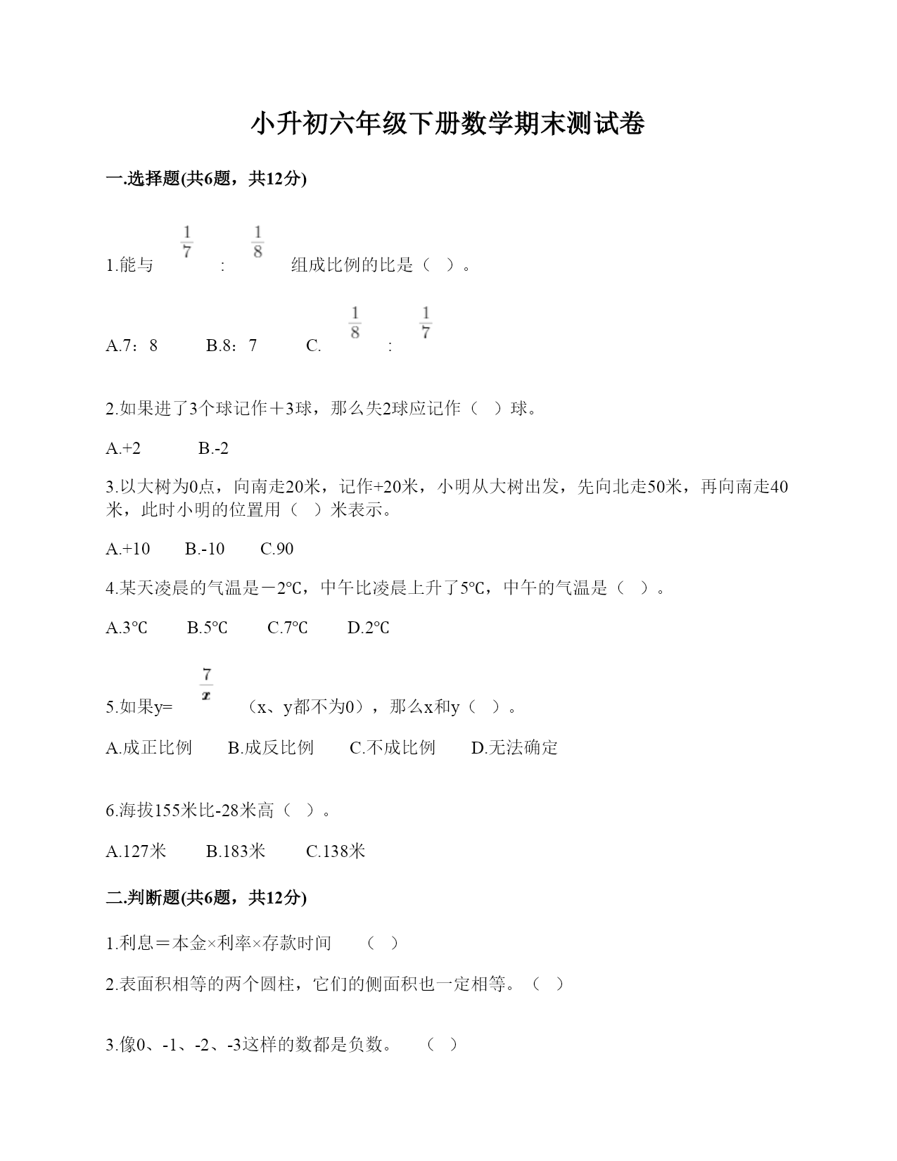 小升初数学期末模拟测试卷及完整答案(考点梳理)
