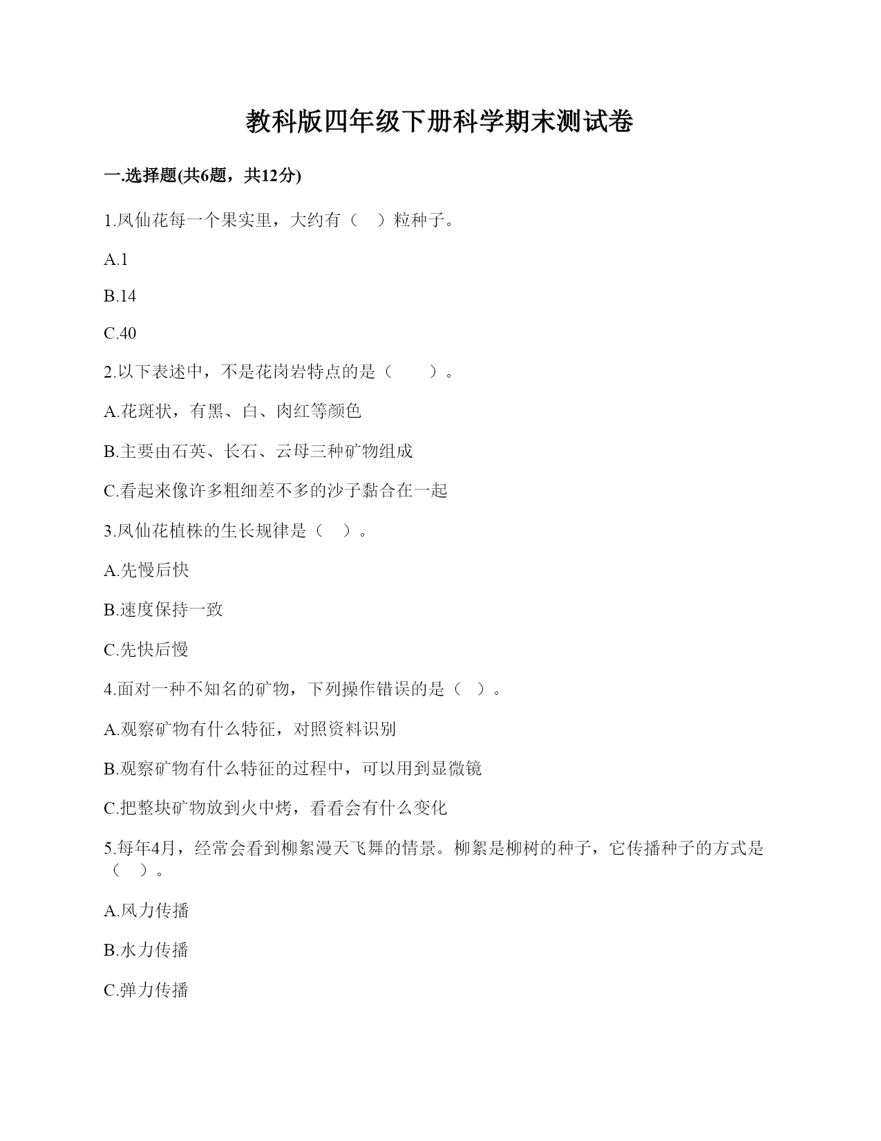 教科版四年级下册科学期末测试卷(精选题)