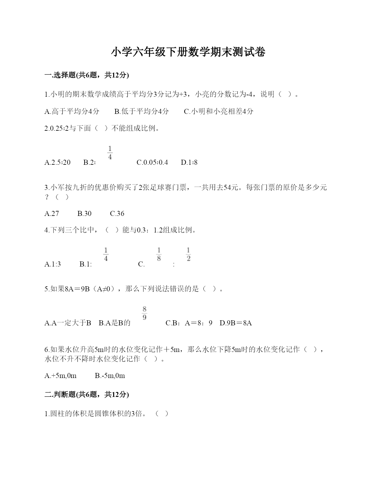 小学六年级下册数学期末考试卷(含答案)