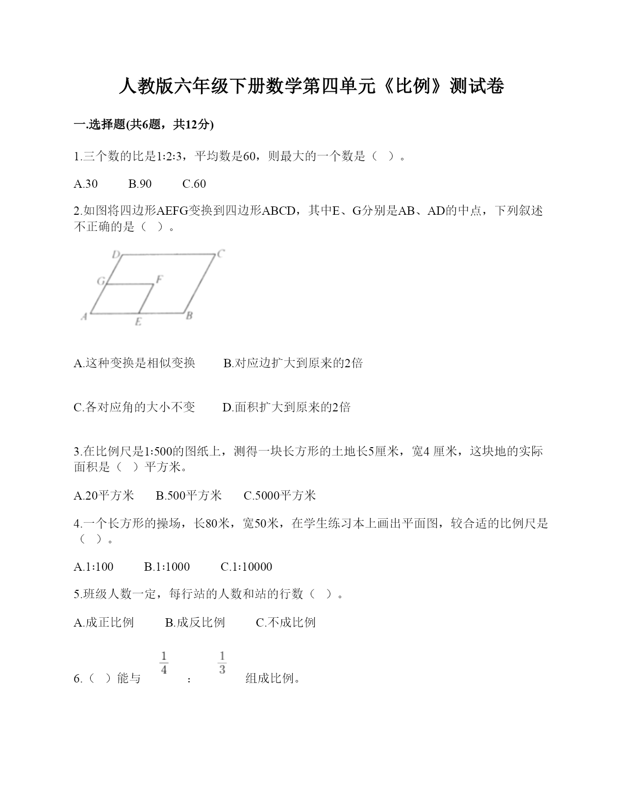 人教版六年级下册数学第四单元《比例》测试卷及答案(新)