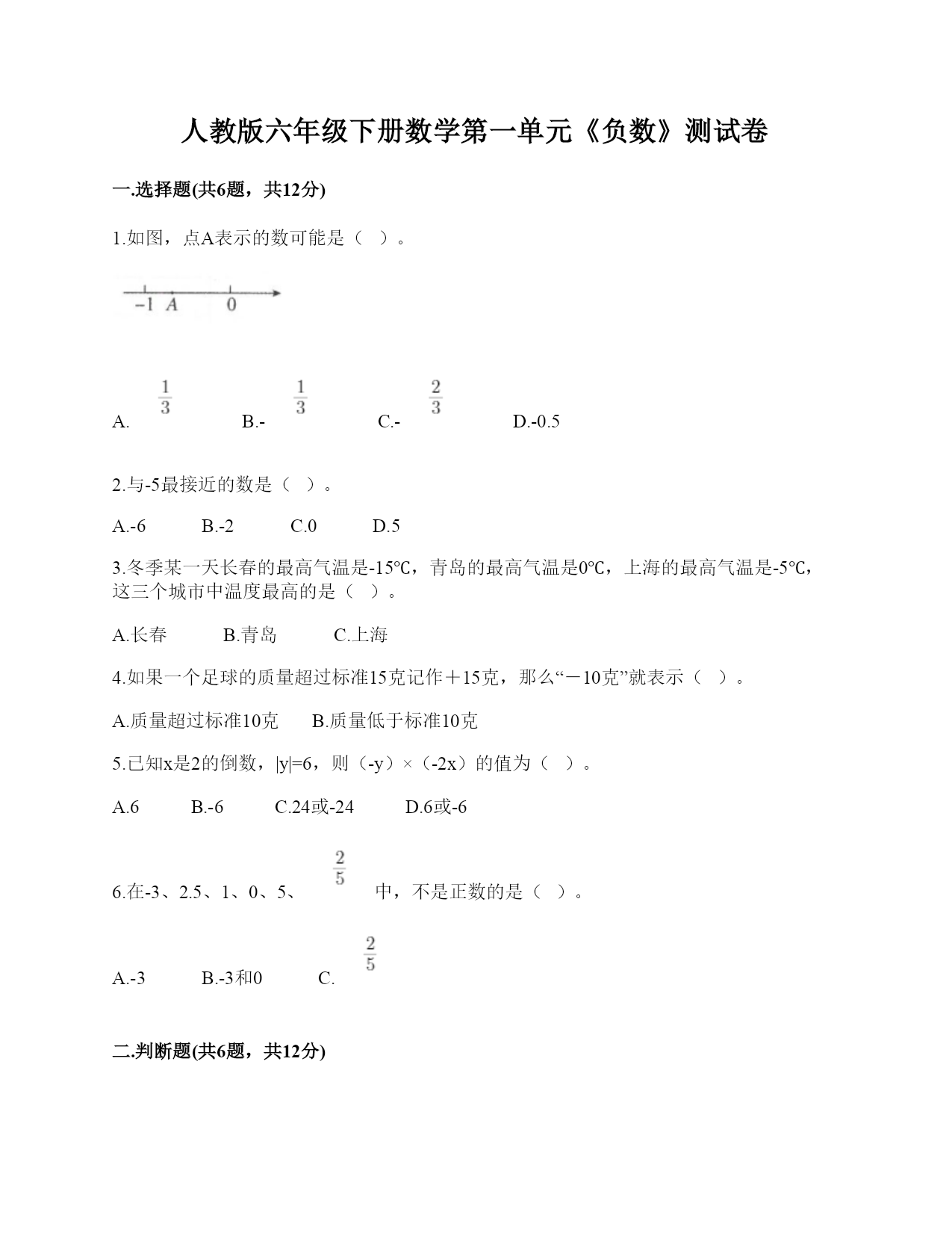 人教版六年级下册数学第一单元《负数》测试卷【全优】