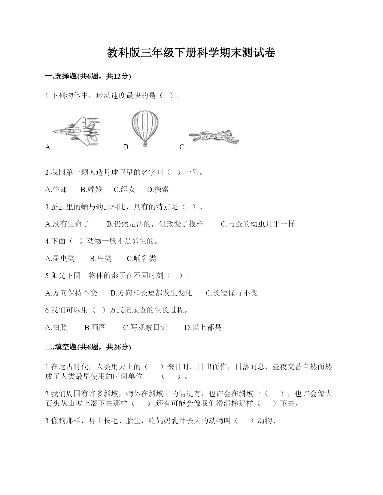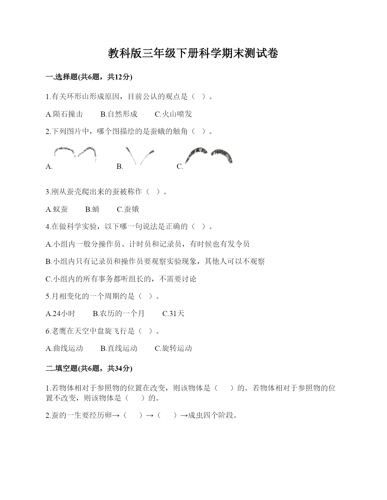 教科版三年级下册科学期末测试卷含完整答案【有一套】