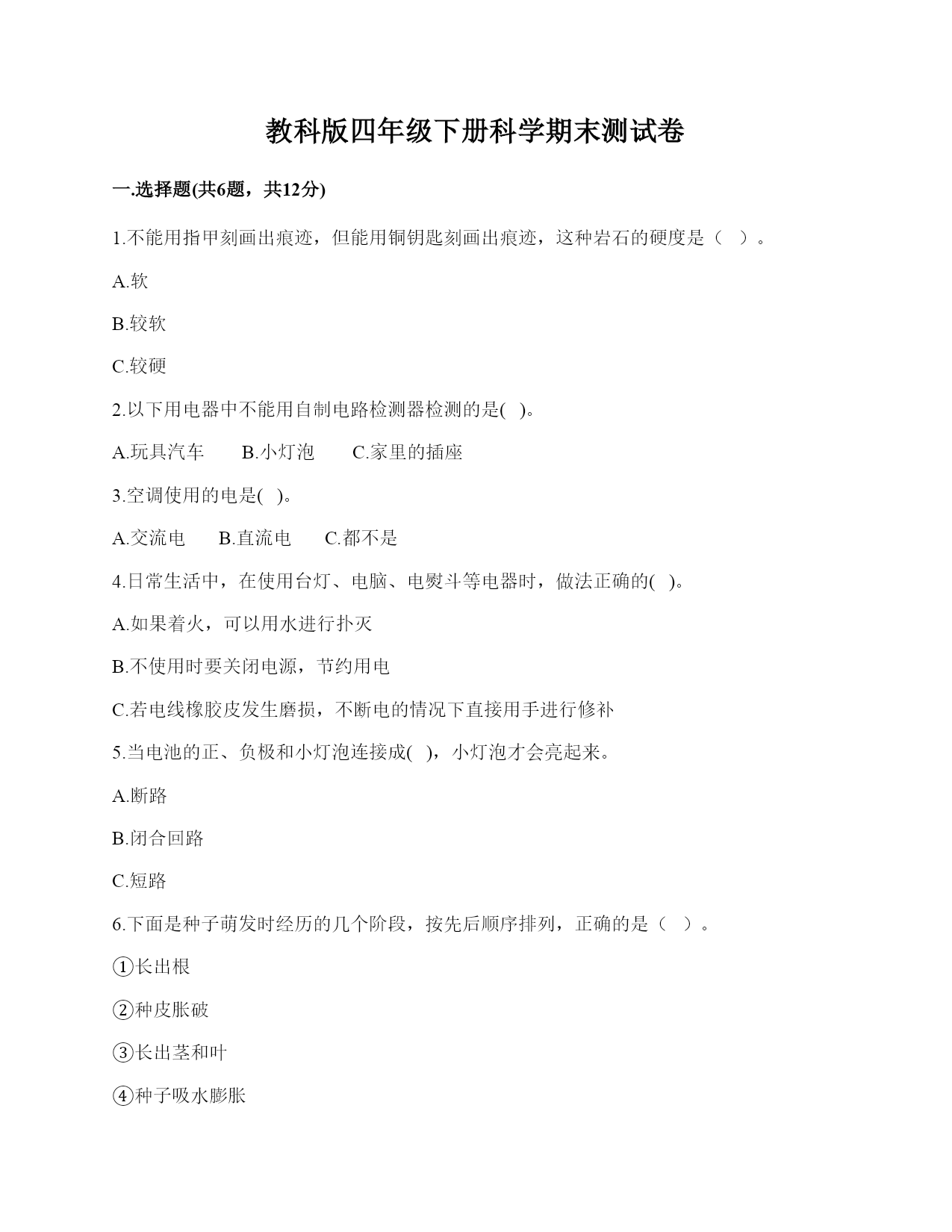 教科版四年级下册科学期末测试卷精品【考点梳理】