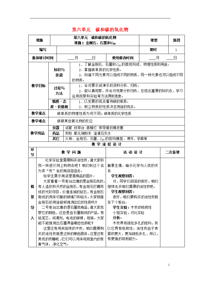 教案-山东-2013_山东省郯城县郯城街道初级中学九年级化学上册 第六单元 碳和碳的氧化物教案 新人教版